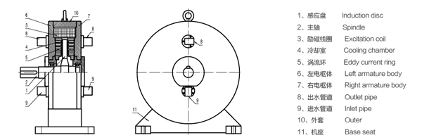 當激磁線圈通上直流電時,其產(chǎn)生的磁通經(jīng)左右電樞體、渦流環(huán)、感應盤,形成閉合磁路,有與轉子形狀猶如直齒輪,當感應盤被原動機帶動旋轉時,渦流環(huán)內(nèi)表面產(chǎn)生疏密相間的磁場,該磁場在渦流環(huán)的表面上任一點呈交變變化,因此在渦流環(huán)內(nèi)表面及一定深度范圍內(nèi)產(chǎn)生渦流,由于渦流形成的磁場與原磁場的相互作用,在感應盤上就產(chǎn)生了制動力矩。
