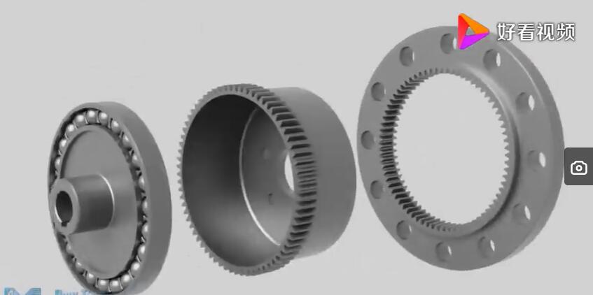 那么我們首先來(lái)看一下諧波減速機(jī)有哪幾部分組成,我們來(lái)看這張圖片。是一個(gè)諧波減速機(jī)的實(shí)物圖,是由三個(gè)部分組成,前面這個(gè)像軸承一樣的叫做主動(dòng)輪,中間的這個(gè)叫柔輪,旁邊的這個(gè)鋼圈和鋼輪,它主要就是由這三個(gè)部分組成。