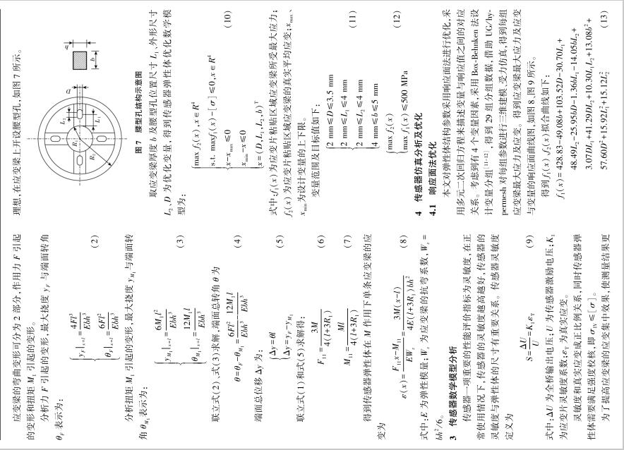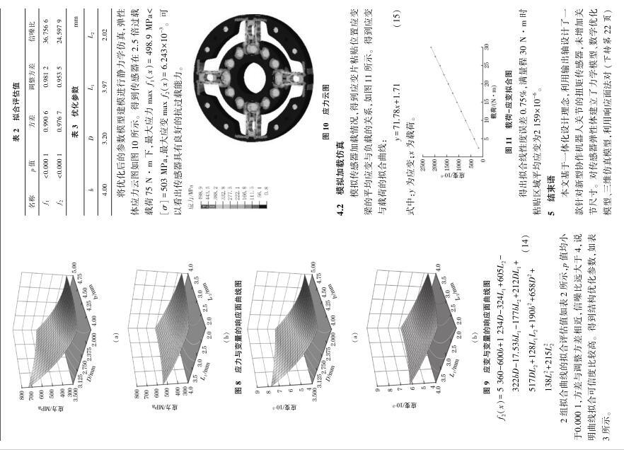 | 扭矩傳感器在機(jī)器人關(guān)節(jié)上的應(yīng)用 為確保協(xié)作機(jī)器人的安全性,需要在協(xié)作機(jī)器人關(guān)節(jié)處安裝扭矩傳感器,由于協(xié)作機(jī)器人自身關(guān)節(jié)尺寸有限且負(fù)載比較小,需要一種結(jié)構(gòu)緊湊、靈敏度高的扭矩傳感器。 為解決這一難題,在分析傳統(tǒng)輪輻式扭矩傳感器的基礎(chǔ)上,提出了一種機(jī)器人關(guān)節(jié)輸出軸和傳感器一體化的結(jié)構(gòu),對(duì)傳感器彈性體建立力學(xué)模型、數(shù)學(xué)模型,使用響應(yīng)面法對(duì)彈性體結(jié)構(gòu)參數(shù)進(jìn)行優(yōu)化,根據(jù) Box⁃Behnken 法進(jìn)行變量設(shè)計(jì),然后利用 UG/ Hypermesh 進(jìn)行有限元仿真驗(yàn)證。 結(jié)果表明,優(yōu)化后的傳感器具有良好的抗過載能力、線性度及靈敏度。 Abstract:In order to ensure the safety of the collaborative robot,it is necessary to install torque sensors at the joints of thecollaborative robot.Torque sensors with compact size and high sensitivity are needed due to collaborative robot joint’s size limita⁃tion and small load.To solve this problem,an integrated structure of output shaft and sensor was proposed based on analysis of thetraditional cross⁃beam torque sensor.The mechanical model and mathematical model for the sensor were established.Response sur⁃face methodology was employed to optimize the sensor structural parameters.Variables were designed by Box⁃Behnken design. Then UG/ Hypermesh was used for finite element simulation verification.The results show the optimized sensor has good anti⁃over⁃load capability,linearity and sensitivity. 協(xié)作機(jī)器人作為新興產(chǎn)業(yè)代表 [1] ,被視為實(shí)現(xiàn)中國制造2025 的關(guān)鍵 [2-3] 。 協(xié)作機(jī)器人由于與人協(xié)同工作更強(qiáng)調(diào)安全性 [4] ,高靈敏的扭矩傳感器能夠準(zhǔn)確測量機(jī)器人關(guān)節(jié)受力情況,從而確保足夠的安全性。 而如何獲得最優(yōu)的傳感器彈性體結(jié)構(gòu)一直是設(shè)計(jì)難題 [5] 。 潘新安等通過將應(yīng)變片粘貼在諧波減速器柔輪上測量扭矩,但是柔輪的噪聲對(duì)測量影響很大 [6] ;文獻(xiàn)[7]設(shè)計(jì)了“彈簧離合器”式傳感器,能減少關(guān)節(jié)的碰撞力;文獻(xiàn)[8]設(shè)計(jì)了一款異形體傳感器,靈敏度高但彈性體結(jié)構(gòu)復(fù)雜難以加工;王羅羅等設(shè)計(jì)一款帶有保護(hù)梁的扭矩傳感器,測量應(yīng)變梁的剪切應(yīng)變,應(yīng)變較小 [9] ;蔣聰?shù)葘?duì)輪輻式結(jié)構(gòu)進(jìn)行了優(yōu)化設(shè)計(jì),加工性好但增加了關(guān)節(jié)軸向尺寸 [10] 。 本文在詳細(xì)分析傳統(tǒng)關(guān)節(jié)扭矩傳感器測量原理的基礎(chǔ)上,基于一體化設(shè)計(jì)理念,提出了扭矩傳感器與輸出軸一體化結(jié)構(gòu),降低了關(guān)節(jié)軸向尺寸,提高了關(guān)節(jié)負(fù)載/ 自重比。 同時(shí),借助有限元仿真及響應(yīng)面法,得到了一種扭矩傳感器彈性體的優(yōu)化方法。 1 扭矩傳感器需求分析及結(jié)構(gòu)設(shè)計(jì) 1.1 傳感器需求分析 圖1 為新一代協(xié)作機(jī)器人的關(guān)節(jié)內(nèi)部結(jié)構(gòu),即本文傳感器設(shè)計(jì)的應(yīng)用對(duì)象。 由于關(guān)節(jié)外殼、諧波減速器已確定, 故 傳 感 器 最 大 外 徑 應(yīng) 小 于 關(guān) 節(jié) 上 殼 內(nèi) 徑(63.5 mm),內(nèi)輪緣上螺栓圓中心線直徑為 27 mm,最大高度12 mm。 根據(jù)機(jī)械臂工況需求,扭矩傳感器量程為0~30 N·m,且具有2.5倍的抗過載能力,即傳感器能承受75 N·m 的瞬時(shí)載荷,載荷釋放后,傳感器仍可正常工作。 圖 1 協(xié)作機(jī)器人關(guān)節(jié)結(jié)構(gòu)圖 1.2 傳感器整體設(shè)計(jì) 為最大程度減小關(guān)節(jié)尺寸,降低關(guān)節(jié)整體質(zhì)量,采用一體化設(shè)計(jì)理念,將關(guān)節(jié)輸出軸與傳感器設(shè)計(jì)為一體,整體安裝示意圖如圖 2 所示。